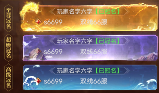 【活动规则】炫彩冠名活动一共分为三个档位,更高档位的冠名可覆盖低档位区服名称与冠名炫彩特效。达到条件的玩家只可申请最高档位的冠名特效与冠名奖励,不可高档位领取低档位的奖励