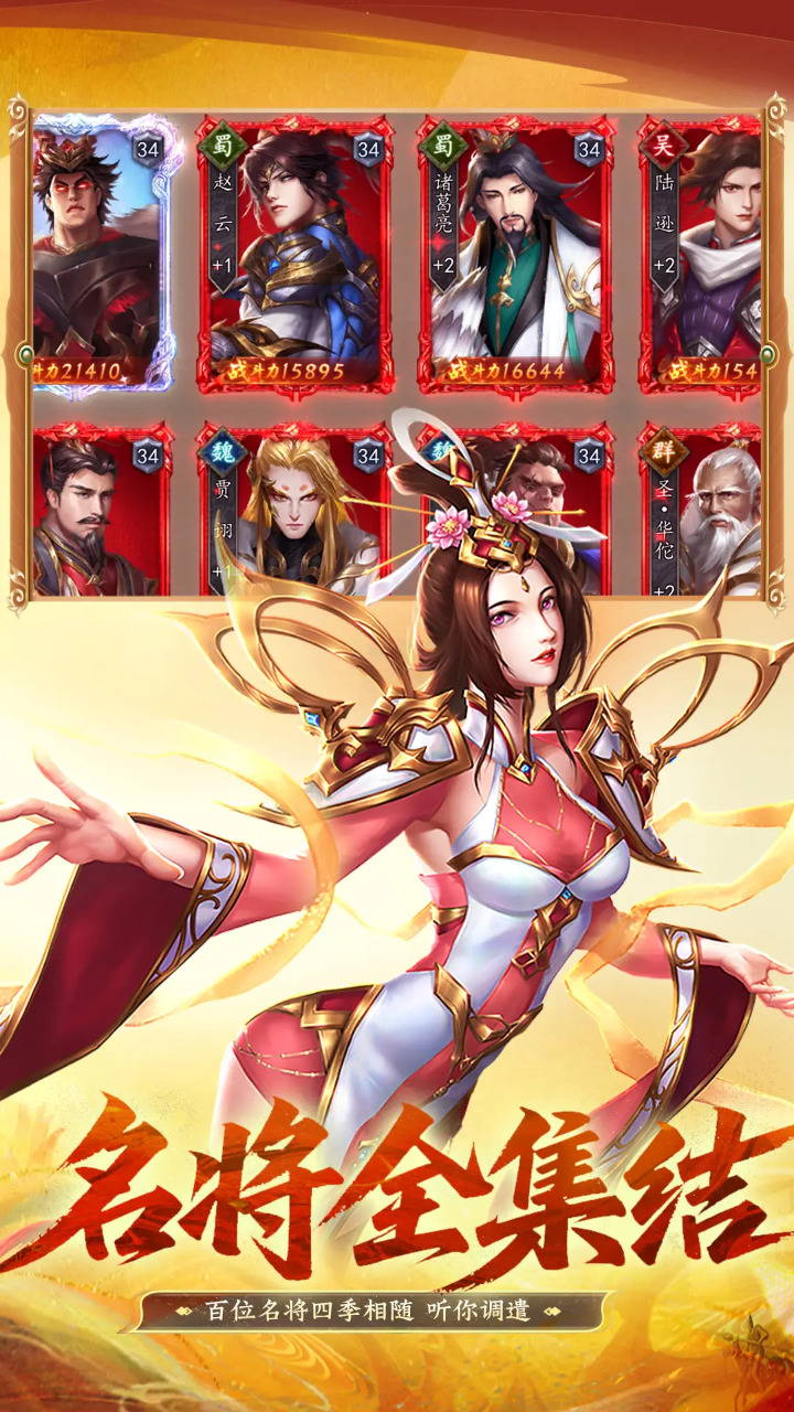 简介欢迎来到风起云涌的三国时代!这是一款颠覆传统的创新手游,完美融合了宏观沙盘策略(SLG)与深度卡牌收集养成玩法,为您带来一场智谋与魄力的终极考验。在这里,您既是坐拥雄兵、布局天下的君主,也是慧眼识珠、调兵遣将的主公。通过精美的卡牌形式,招募数百位耳熟能详的三国英豪。没有无敌的阵容,只有更强的策略!依据对手的阵型,灵活搭配前锋、中军、大营,利用兵种相克和技能连锁,以智取胜。来书写属于您的三国传奇!