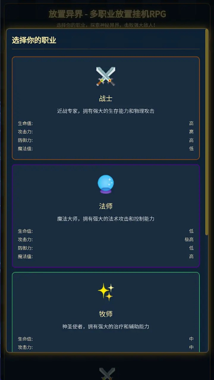 简介欢迎来到放置异界!这是一款轻松休闲的多职业放置挂机RPG游戏。选择你的职业,装备强大的武器,在异界大陆中自动战斗,即使离线也能获得丰厚收益。丰富的装备系统、技能搭配、转生轮回,让你的冒险永无止境!