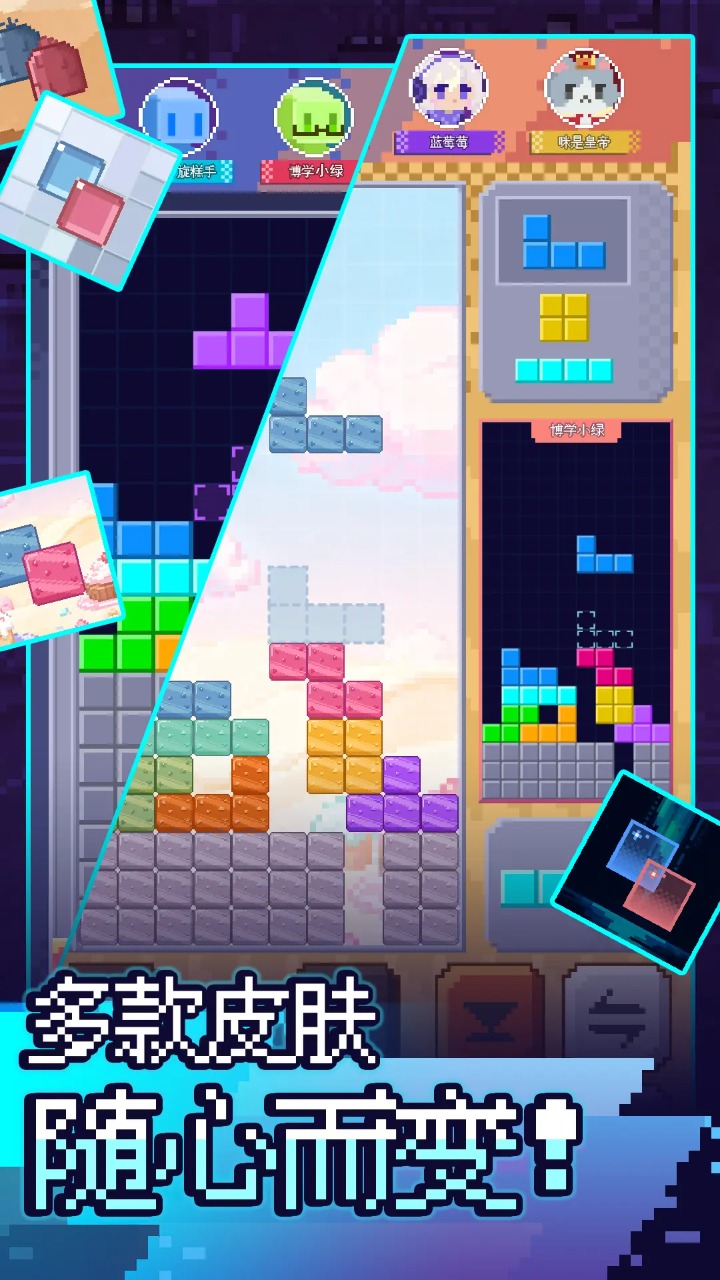 简介经典俄罗斯方块的联机对战玩法,多种方块皮肤等你来解锁! 如果你是专业竞技玩家,现代规则轻松玩,7种方块随机掉落,超级旋转 暂存功能 自定义按键,让你秀出炫操作,冲击强段位; 如果你是社交娱乐玩家,可实时匹配好友或其他玩家,消得越多越能给对手塞“捣乱方块”,看谁先被方块堆到; 如果你是怀旧休闲玩家,精美像素画风,经典单人模式,带你重温一个人偷偷躲在被窝里玩游戏的童年回忆。 总之,不管是摸鱼打发时间,还是和朋友PK 较劲,都能在噼里啪啦的消除声里玩到上头,快来用方块“拿捏”你的对手吧!
