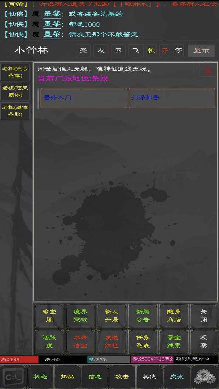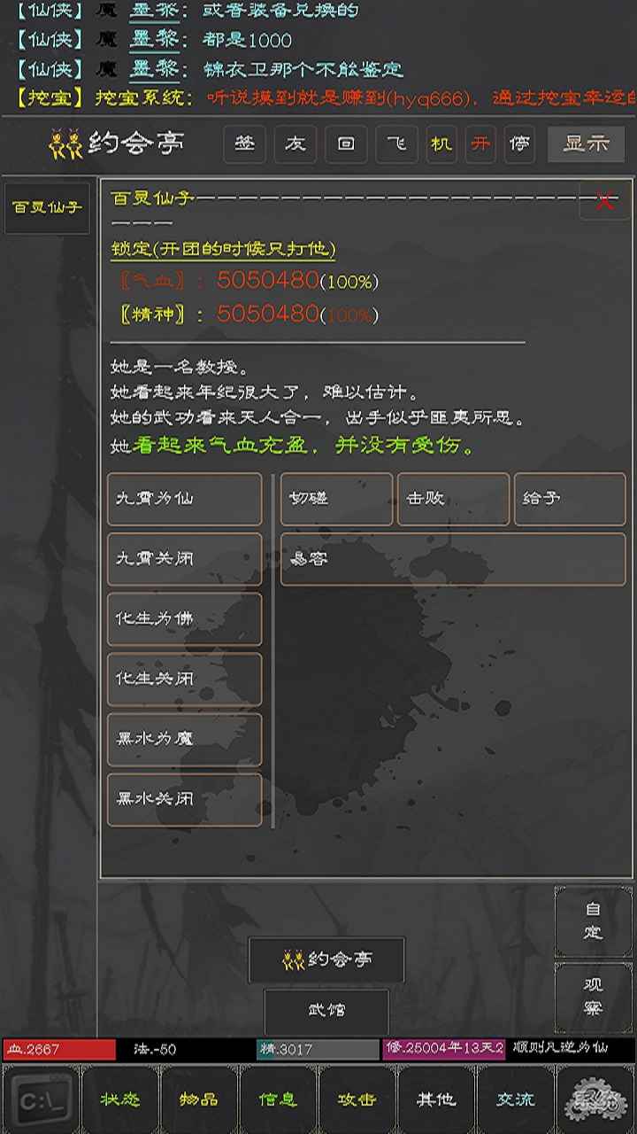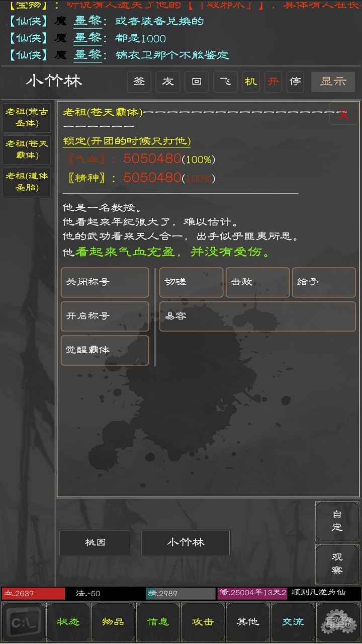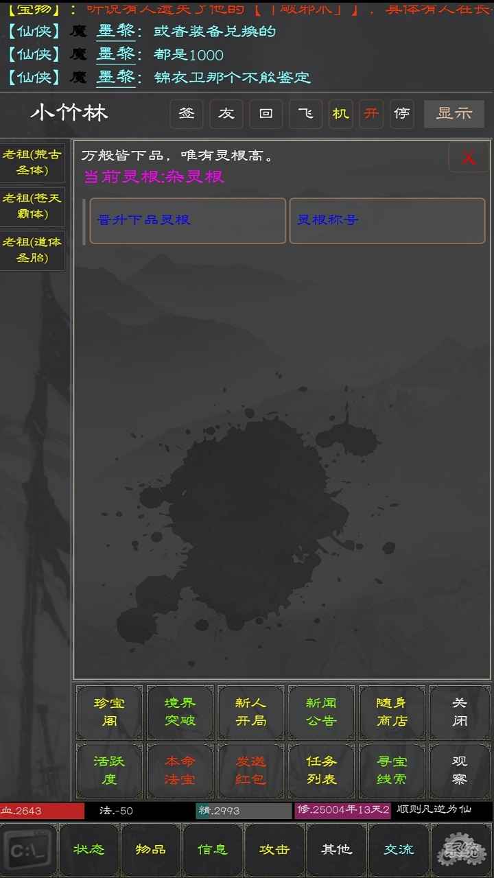 简介本游戏基于从高武到修仙的过程,目前已有灵根系统,肉身系统,悟道系统,境界系统,炼丹系统,打造兵器系统,称号系统等等很多不一样的玩法,各类装备应有尽有,更有苍天霸体,荒古圣体,先天圣体道胎等道友来觉醒,希望能给诸位道友带来不一样的快乐体验。