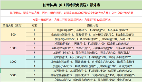 单日累计充值5000(实付50)元:元宝*10000、仙帝初级培养丹*10、灵契石*50、通灵秘宝*2000