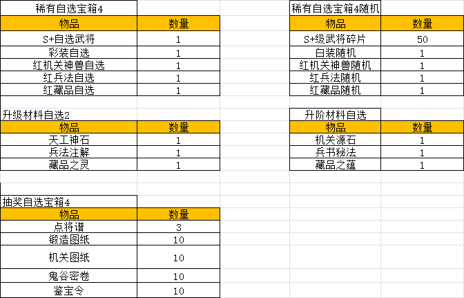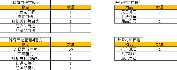 10000稀有自选宝箱4*1,稀有自选宝箱4随机*1,将印锁定石*12,升阶材料自选*35