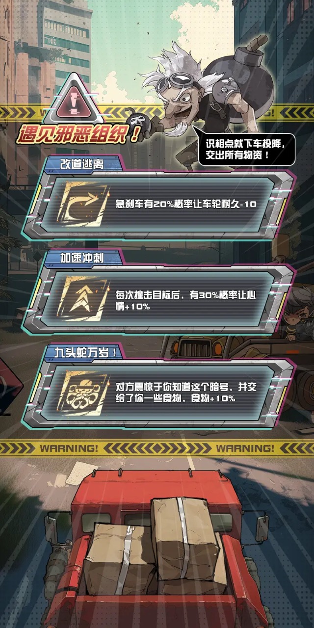 游戏中,你需要对遭遇的各种事件进行合理选择,你可能在路上遇到拦路抢劫的幸存者败类,也可能遇到需要帮助的女大学生,前方可能是物资满满的超级商超,也可能是统领尸潮的强尸王。因此,你还需要不断升级你的战车,这是你末世生存的重要保障,这样才能获得更多物资和更强异能,当然你也需要招揽更多幸存者,这能让你的末世之旅拥有更多可靠的伙伴,他们各有各的能力,各有各的本事,足够的人才储备让你即使遇到再大的困难,也能轻松度过。正所谓钱不是万能的,但没有钱是万万不能的,想要在末日有所建树,如何获取更多资金也是你需要考虑的事情,但没关系,你已经垄断了末世赚钱的行业!末世乱不乱,爷你说的算!