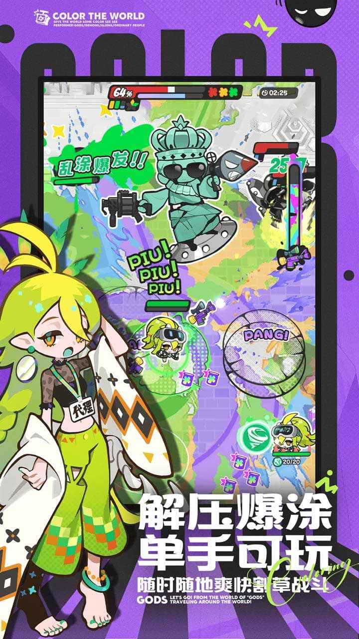 染色爆屏,烦恼清零~划动指尖,和高颜值不正经的神明娘组队闯关,用颜料轰炸这个黑白世界。在这里,无需复杂的操作,与你并肩作战的神明会自动瞄准目标,只需尽情释放情绪,享受piupiu爆涂的解压快感。