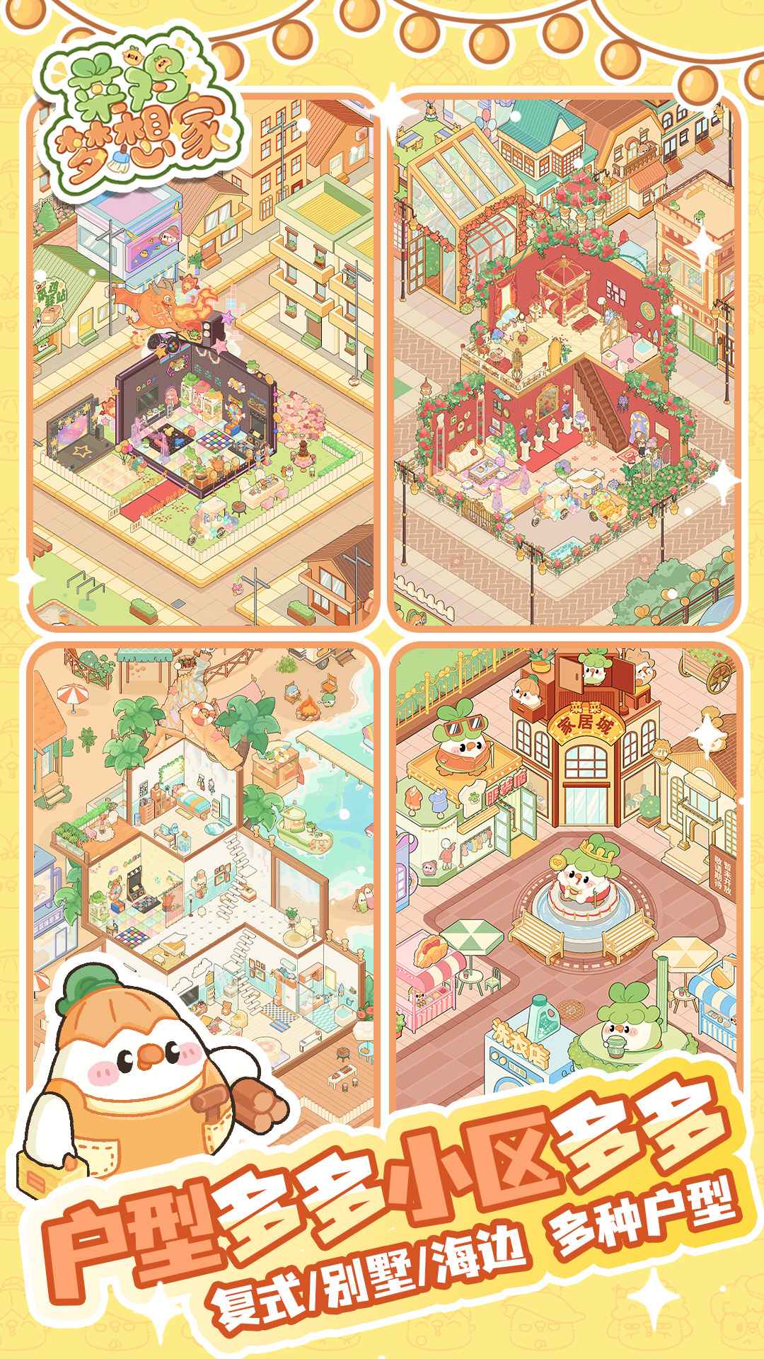 简介《菜鸡梦想家》是一款中度的模拟类休闲移动游戏,核心玩法是让玩家收集各类家具进而装修自己的房屋,游戏亮点是以小红书网红IP”小菜鸡“为核心来构建整个游戏的世界观和玩法。