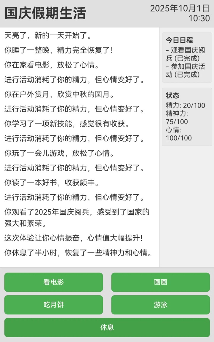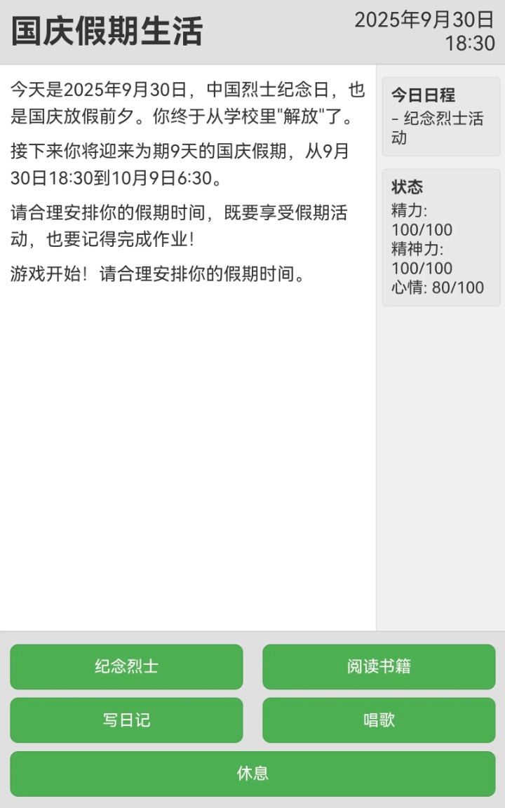 简介《未完成的作业:国庆》是一款充满乐趣与休闲氛围的文字游戏。游戏设定在一个国庆和中秋的假期,玩家扮演一名学生,在游戏中度过有意义的八天假期。