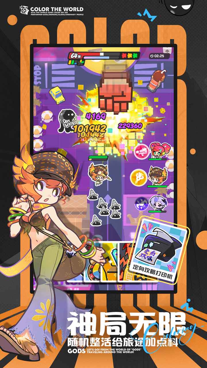 心愿自选,拒绝歪卡~无论是恶魔还是天使都任你pick~超会营业的地偶爱神丘比特,”无意”引发一场又一场爆炸的恶作剧之神洛琪,誓死守卫披萨不被菠萝”污染”的教会圣女狄安娜,全员“不正经”神格任你解锁。全员共享养成进度,无缝切换战斗搭档,见证不同神明碰撞出的奇妙颜色反应,你的染色小分队永远充满新鲜感!