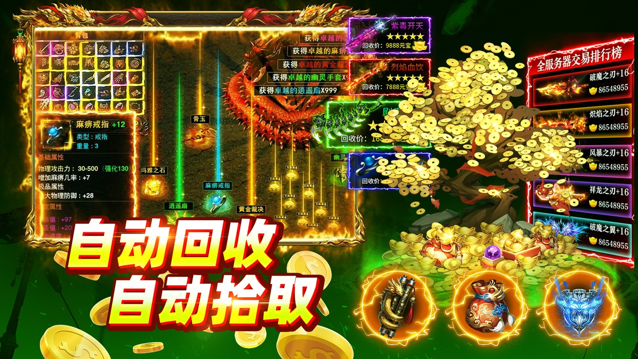 《大剑传奇》是一款原汁原味的复古传奇手游,完美还原经典“战法道”三职业。地下抢宝、激情乱斗、树妖降临、仙魔大战、热血攻沙等经典玩法一应俱全,更有远古战场、洪荒禁地、群雄逐鹿等重磅跨服战场,点燃无限激情! 游戏主打高爆率、装备靠打、自动回收、元宝持续产出,轻松挂机即可打宝赚收益,散人也能畅快逆袭!新服盛大开启,福利拉满 —— 自动回收、自动拾取、背包全开、会员免费开通,上线即享超爽体验! 游戏特色 --游戏特色-- 【上线即领豪礼】 开局直接赠送助力礼包,军功、重铸石、海量红包免费拿,起步快人一步! 【全图装备全爆】 全地图无限制打宝,所有装备均可打怪掉落,小怪也能出终极,不氪也能当大佬! 【平民轻松逆袭】 零氪也能畅玩无阻,挂机爆装两不误。免费开通会员,战力飙升、攻速拉满,轻松开荒称霸全服! 【打金自由搬砖】 打怪领红包,装备回收秒到账,双渠道稳定产出,人人都能打金赚翻天! 【热血万人攻沙】 经典攻城热血重燃,万人同屏激战,兄弟齐心拿下沙城金库,问鼎霸主,铸就传奇!
